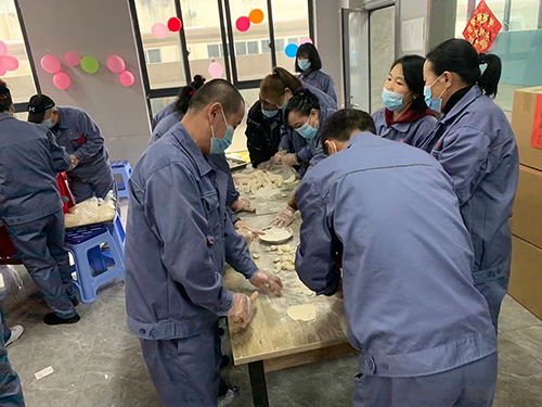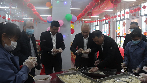 在溫州喜發實業有限公司,吳錫雕詳細了解了企業為留蒼員工提供的生活保障措施和企業生產經營、規劃布局等情況,并和留蒼員工一起包餃子,為大家送上防疫物資和年糕、鹵制品等蒼南特色年貨,對他們留在蒼南過年的做法給予肯定和感謝,希望他們在蒼南度過一個歡樂祥和的春節假期。